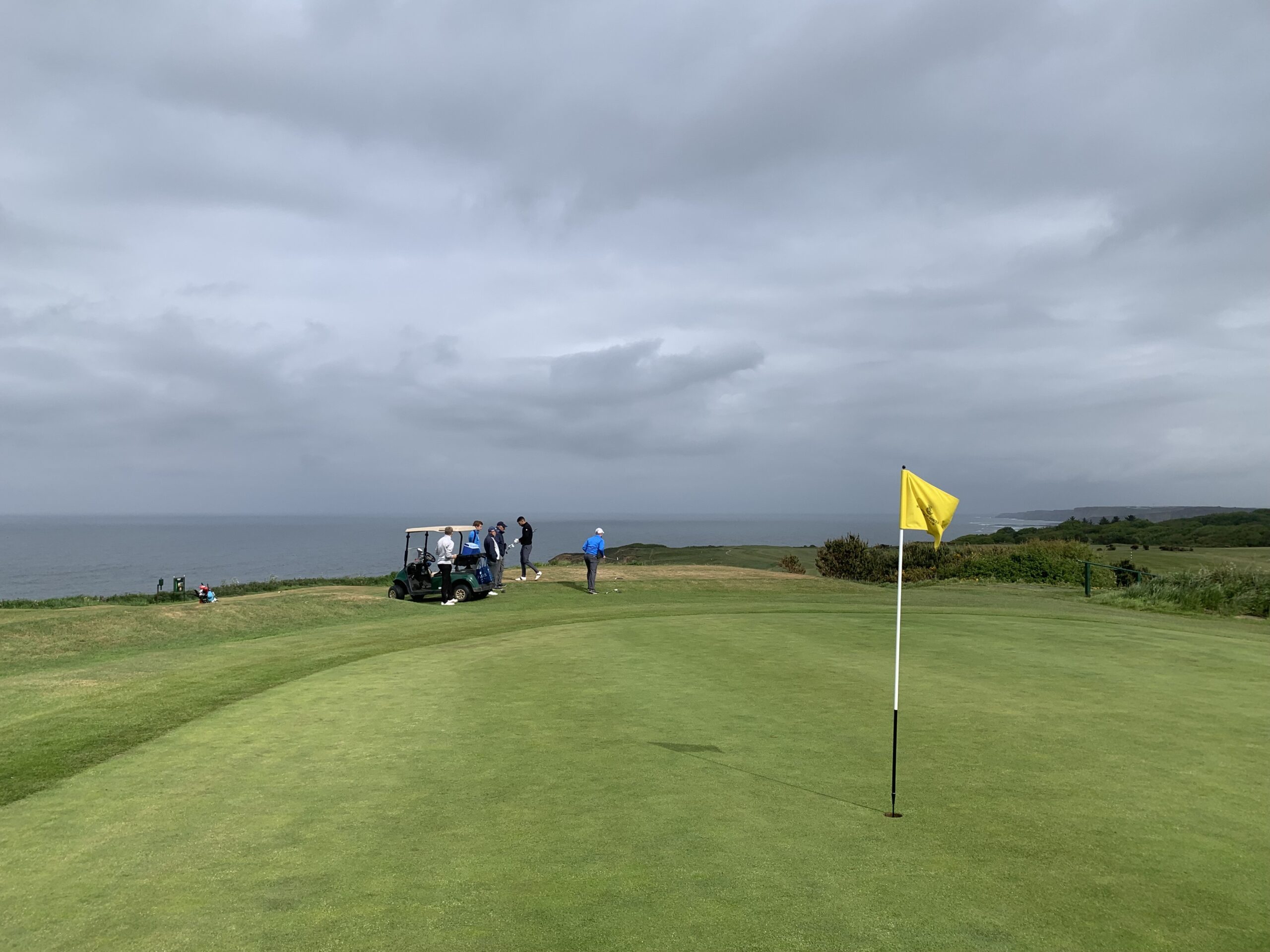 Warren Burns’s big hitting in the stiff wind was a feature in match 6 (8th on the course), sending his drive so far right off the spectacular 5th tee that no-one was sure which fairway (or course for that matter) he was on. A succession of impressive drives and approach shots, including a 376 yard bomb at 11, 20 feet of ‘checkinoffski’ (backspin for those unfamiliar with the term) at 12 and a stinger driver into the breeze at 13 finally did for his bemused opponent. Full points for Warren on the day.