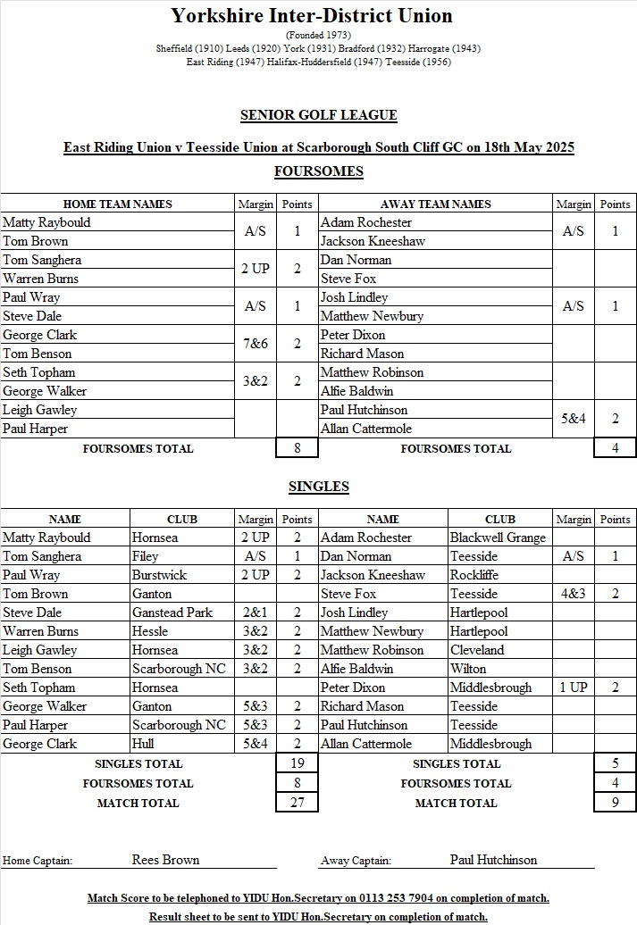 The final two matches were poles apart in terms of age and experience, but it was the young pairing of Seth Topham (Hornsea) and George Walker (Ganton) who delivered their point on debut – a superb 3&2 success against Alfie Baldwin and Matthew Robinson. Time after time the boys dug in for gritty halves to stay ahead thanks to Seth’s hot putter and George’s assured iron play.