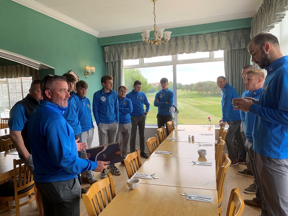 With several ‘big guns’ not on the cliff top through unavailability, injury or delayed returns from colleges in the States, the new gaffer was conscious that his foursomes pairings would be key. A stirring first team talk (below) did the trick and Brown’s Boys were off and running.