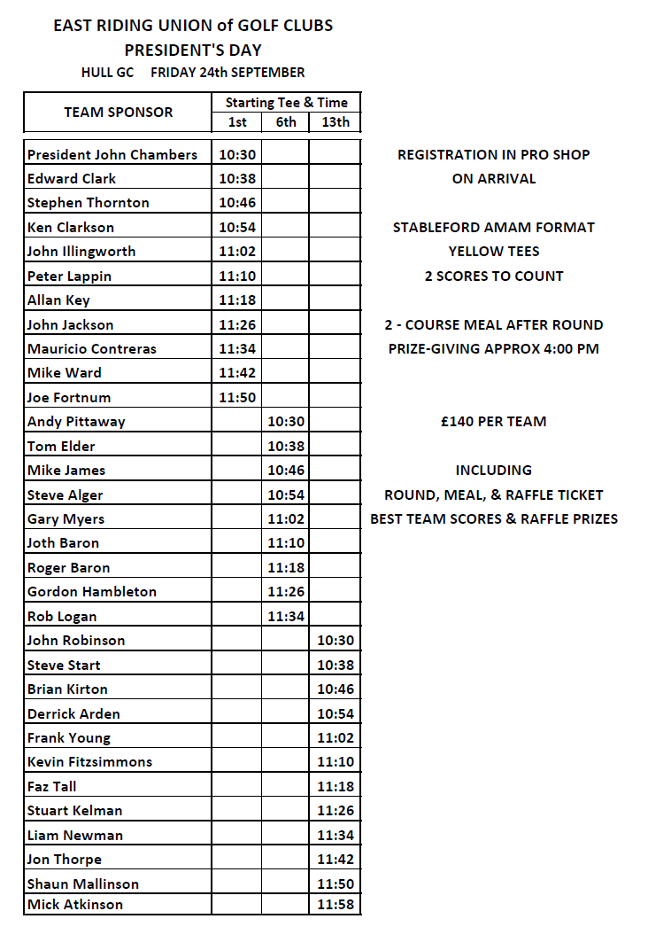 The tee times for the ERUGC President’s day on Friday 24th September at Hull Golf Club have now been drawn.