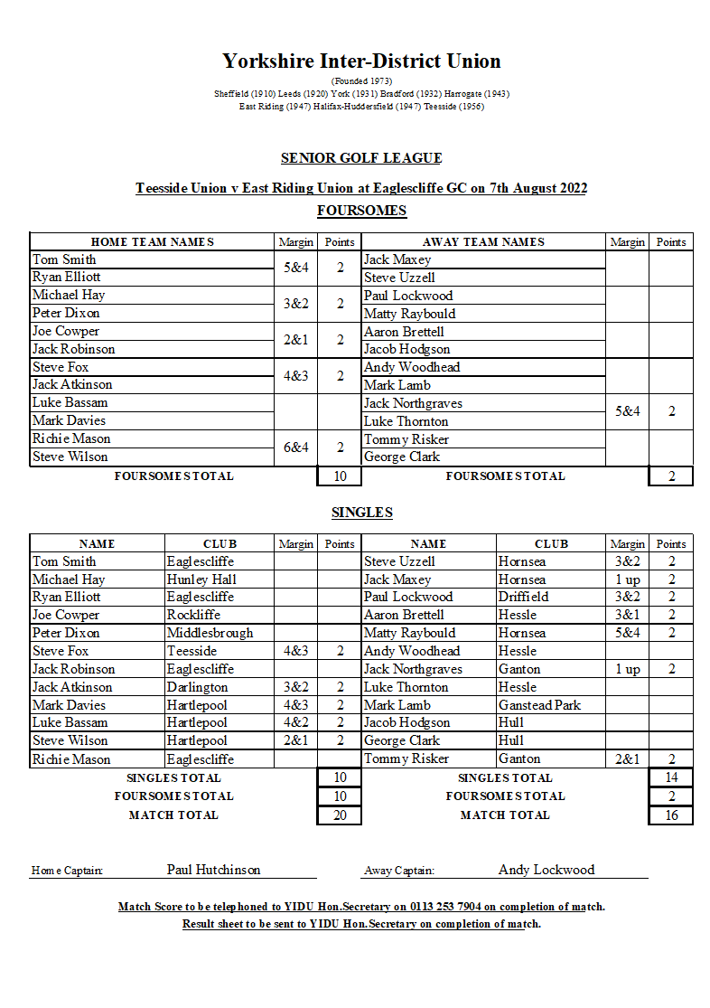 Sadly, the early successes did not prompt the “tail to wag” and with all of the remaining five games down at halfway, only Tommy Risker was able to reverse the scoreline for a win by 2&1. So East Riding won seven singles to Teesside’s five, giving an overall scoreline of 20:16 to the home side.