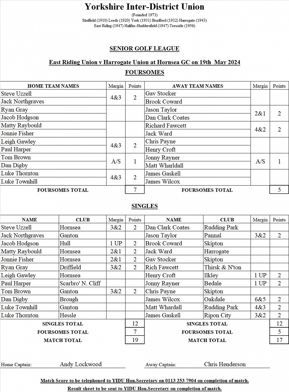 Leigh Gawley and Paul Harper both lost their matches on the last and Dan Digby ran into an inspired opponent and lost 6&5. News of the two Lukes playing at 11 and 12 was not good either, but thankfully the tall figure of Ganton’s Tom Brown appeared down the long 16th at 2up. A sensational pitch to two feet for a birdie got the job done and reigning YIDU League champions East Riding had opened their 2024 campaign with a hard fought win.