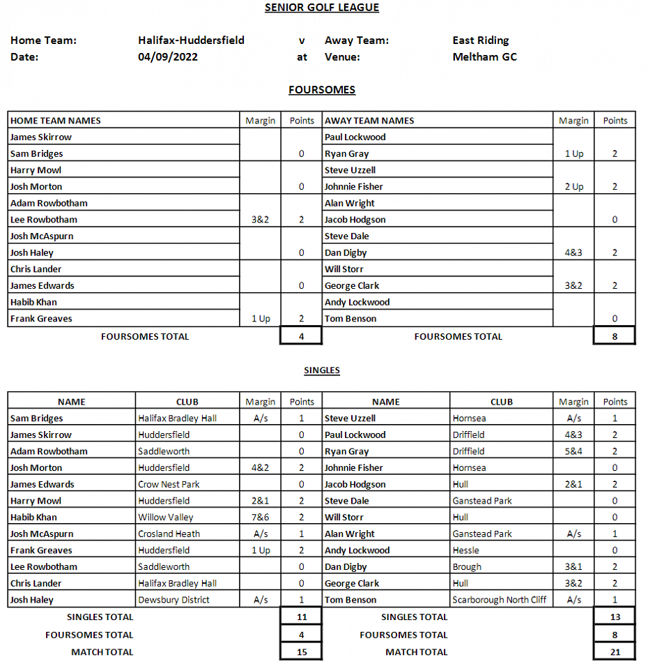 For only the third time in the season, East Riding took a lead from the morning foursomes, fighting off a late challenge from Halifax Huddersfield in the top two games, both of which went to the 18th. The last game, which had the two Team Managers pitted against each other, was a tight contest, which also went the distance, with the home side prevailing and this pairing and the identical result was repeated in the afternoon singles.