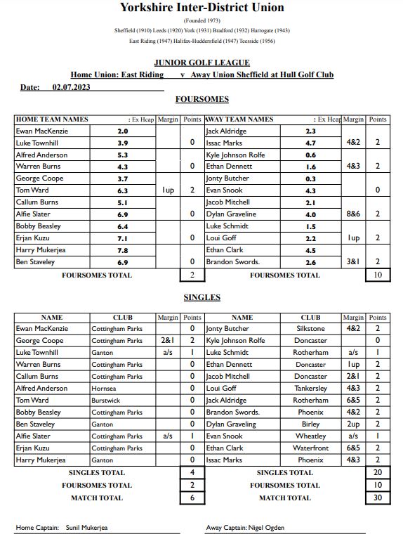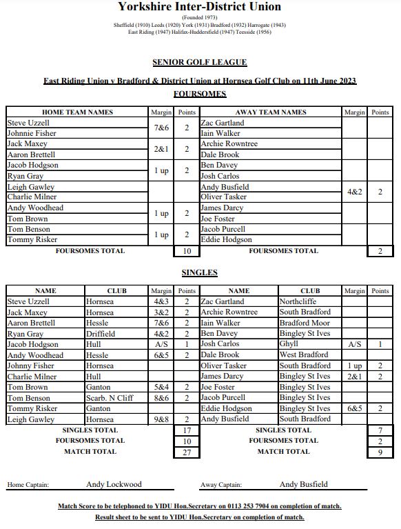 East Riding 27 – 9 Bradford Hornsea Golf Club Sunday 11 June, 2023 reort to follow