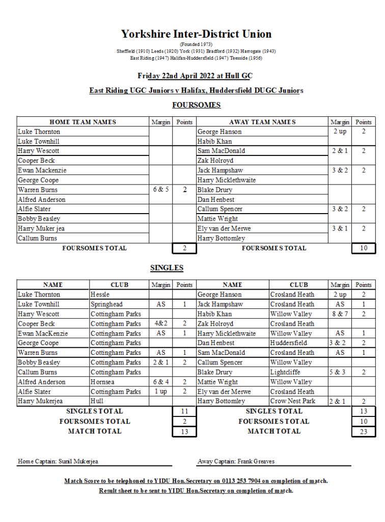 Junior League 2022 Here are the current standings in the 2022 Junior League after 3 rounds, Hull in a strong lead on 12 points but Hornsea, Cottingham and Burstwick all […]