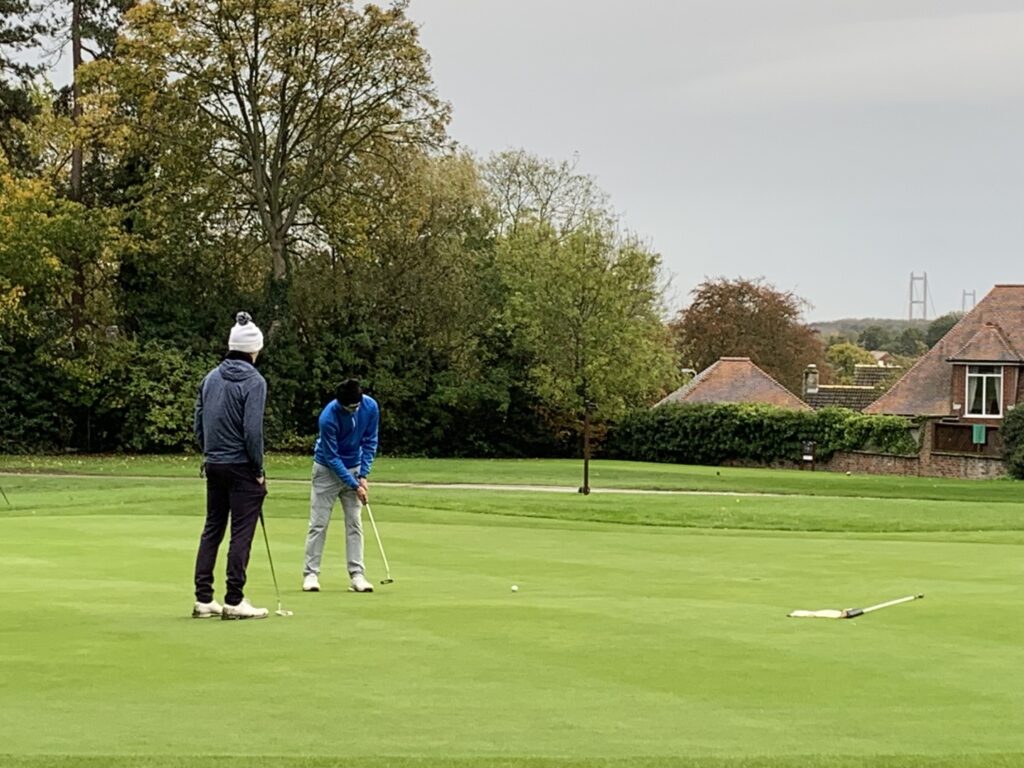 However, a clumsy bogey at 12 gave the Caveman some hope and things looked in the balance again as Huxley arrowed a wedge to 8 feet at the short 13th. George holed from slightly further though (pictured below) and then really took control with a sensational birdie at the dog-leg 14th. His fourth birdie in seven holes – quite some scoring on Hull’s pure pacey greens.