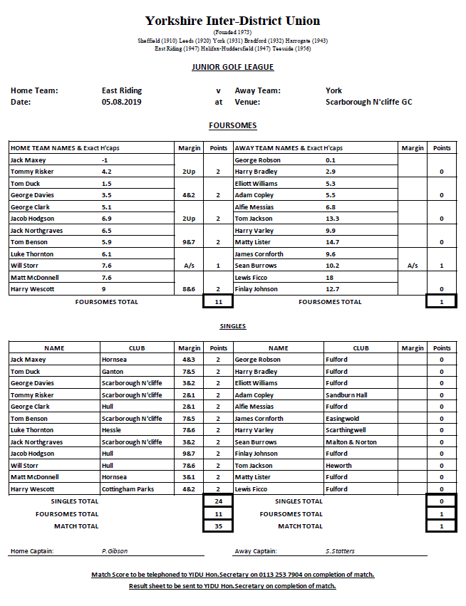 The momentum was certainly with the East Riding as they won 3 out of the top 4 games with victories from George Davies, Jake Sowden and Tommy Risker to put the East Riding in touch distance of another win. After the impressive Jack Northgraves won his match 5&4 it was left to Tom Benson to roll in a 45 foot putt on his final hole to record a 2up victory. His victory ensure the East Riding won for the forth time in a row and remain on course for a strong finish to the season
